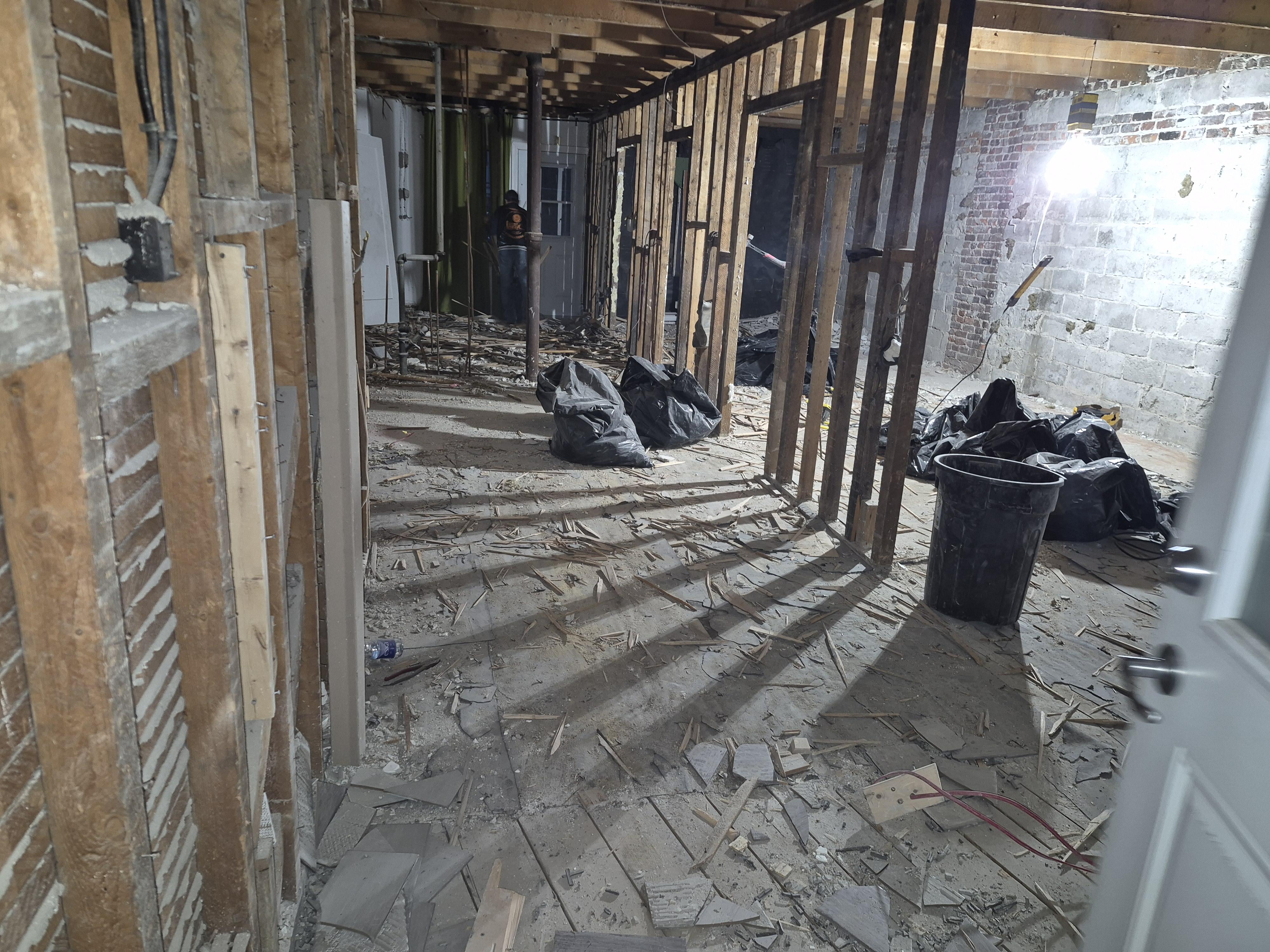 Dégarnissage complet, enlèvement des cloisons légères et préparation du site pour travaux de construction.