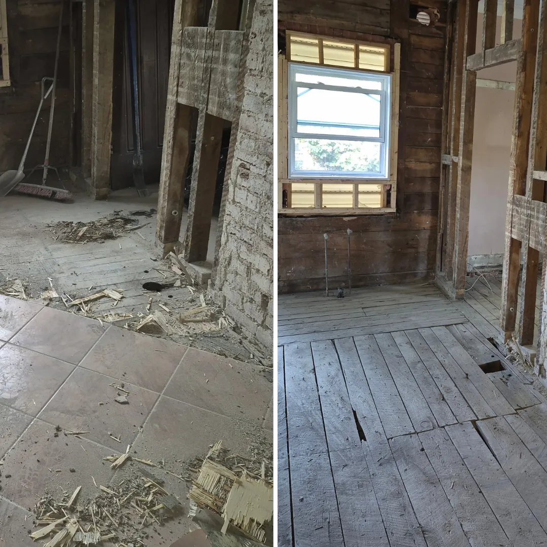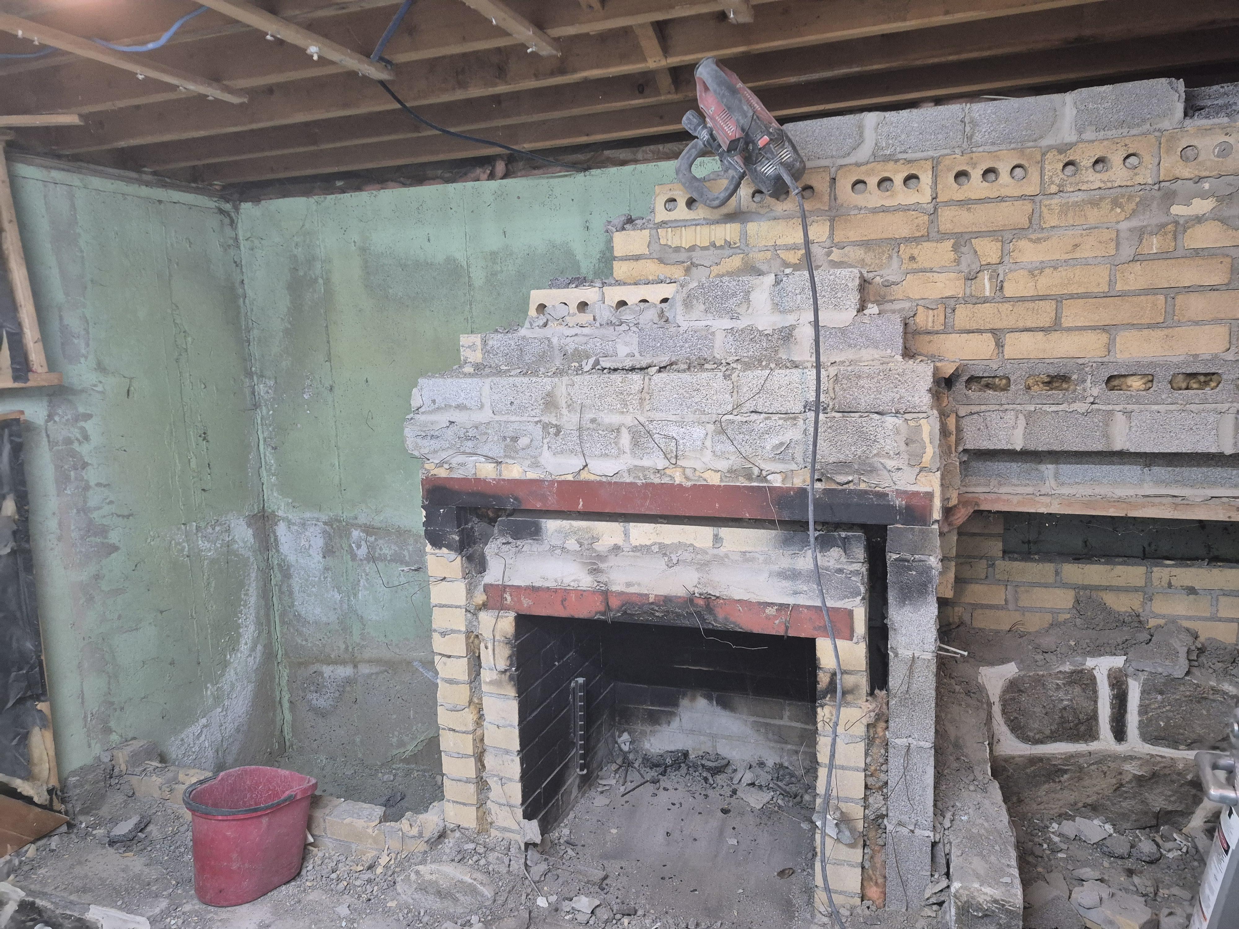 Démolition intérieure complète d’un rez-de-chaussée incluant cuisine, murs non porteurs, plafonds et planchers.
